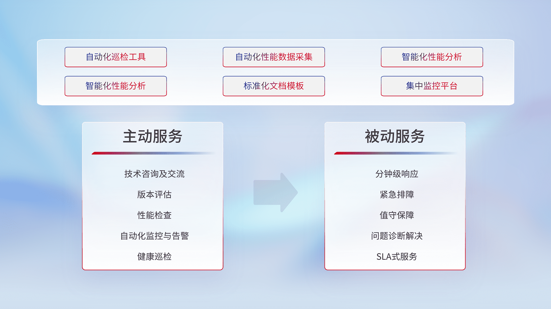 智能化工具和标准化文档,,,保障服务质量,,,,提供主动服务(包含技术咨询、、、、版本评估、、性能检查、、自动化监控与告警、、健康巡检)和被动服务包含(分钟级响应、、紧急排障、、、值守保障、、、、问题诊断解决、、、、SLA服务)。。
